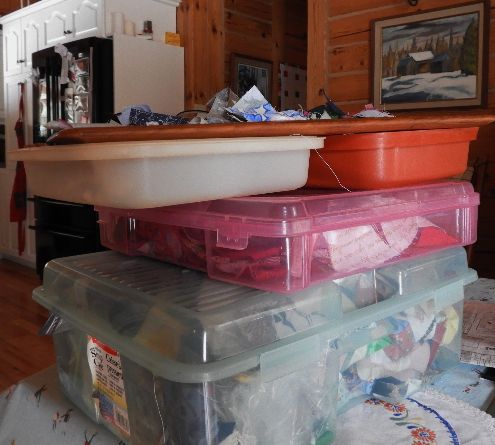 You wouldn't think I've done enough quilting to have accumulated this much scrap material. Testimony to the endurance/cleverness of tupperware-those two pieces on the top neatly fit into each other as well as one can act as a cover for the other but they must be about 50 years old...from the old house.
